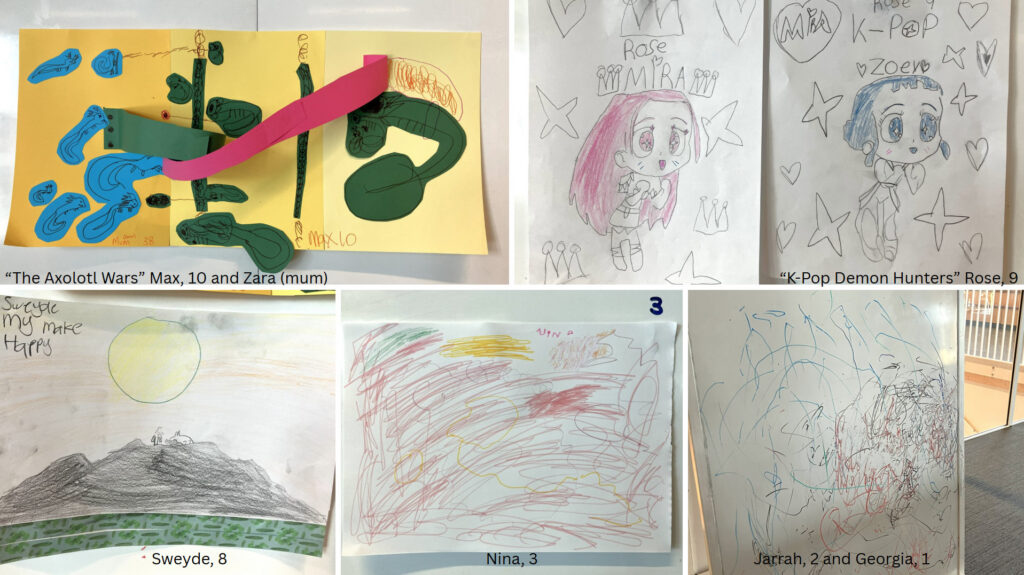 On Sunday April 12, the day before national Auslan Day, Sign on Screen held a screening of Auslan short films for Canberra-based d/Deaf and hard of hearing children and their families. We came together on the ANU campus to watch videos of sign language stories, jokes, vocab and songs, accompanied by Kellyanne Rosalion, a Deaf ACT member who runs Canberra’s Sign and Play group. Kellyanne had the kids signing along and sharing their opinions, whether they were ten or two years old. After the screening, we did a drawing and collage workshop about what we would make if we made our own movie. The results show we have some future filmmakers on our hands!